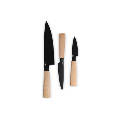 the Insideout Ravn Essential Knife Set Combines Elegance & Functionality. This Set Contains a Paring Knife (12 Cm), Utility Knife (23.5 Cm) & Chefs Knife (32 Cm) & is a Stylish Addition to Any Kitchen. with Striking Black Blades & Sleek Fsc-Certified Beech Wood Wood Handles, the Set Offers a Modern Look. Both the Handles & Blades Can be Laser Engraved. Packaged in a Luxury Gift Box, Perfect as a Gift or for Personal Use. Minimum Quantities Apply.