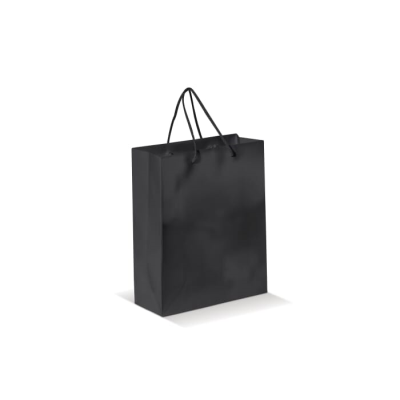 Medium Sized Paper Bag with Rope Handles. Available in Multiple Colours with Straps in Black or White. Large Print Area on Both Sides. Strong Bag. Glossy Lamination. Minimum Quantities Apply.