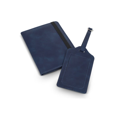 Travel Set Featuring a PU Passport Holder with Rfid Blocking, Elastic Closure, & Space for a Passport, 4 Credit Cards, 2 Sim Cards, Plus Additional Slots for Items Like Boarding Passes. Includes a Luggage Tag with a Buckle Strap & a Card to Fill in Name, Phone, Address, & E-Mail for Easy Identification. the Contact Card is Printed in English. Minimum Quantities Apply.