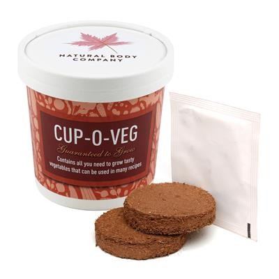 12oz White Paper Cup Containing Two Cocopress® Compost Tablets, a Seeds Packet with a Wide Variety to Choose From Including Veg, Radish, Onion, Cabbage, Lettuce & Parsnip Along with Planting Instructions & a Branded Paper Label to the Lid. Minimum Quantity: 25